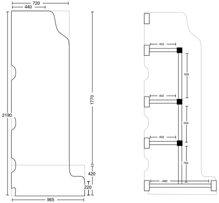 Let me explain the plan… The left diagram is of the top surface of the desk - the cut-outs down the left edge are for cables to go down, and the bottom one also makes room for the hot water pipes that go up the wall. The right diagram is of the frame that will support it. Little white rectangles are the supporting mounts that attach to the wall. Thin white rectangles are the supporting struts that run from the wall mounts to the legs and keep everything stable. Black squares are legs.