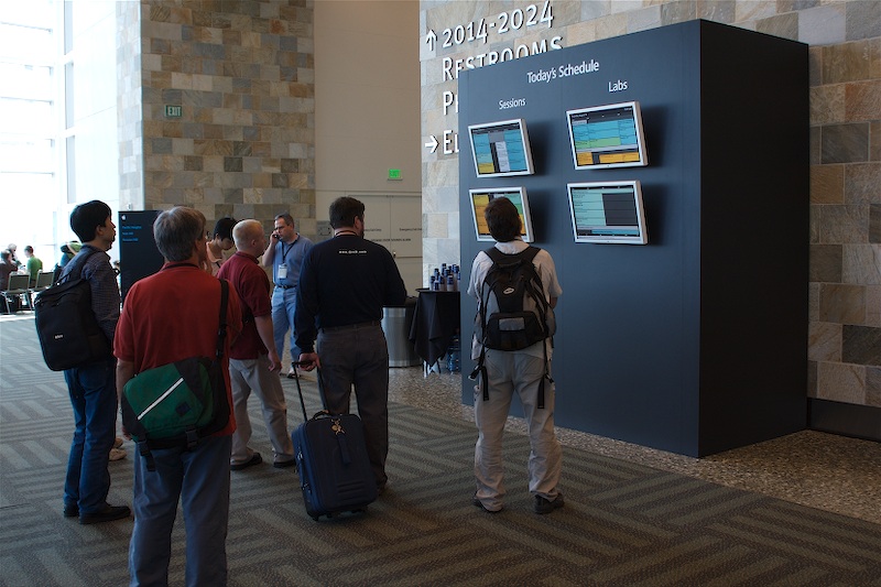 Sessions are normally presentations given about a particular subject. There are also a few “hands on” sessions, which let you follow along with what’s happening on your own computer, and “feedback forums” let you talk back to the developers of a particular part of the system and give them opinions, requests, etc.