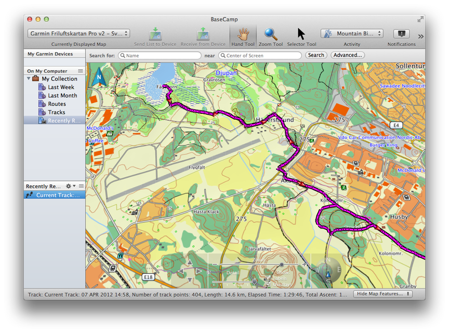 BaseCamp’s Map Display, overlaid with a track of a recent bikeride (magenta).