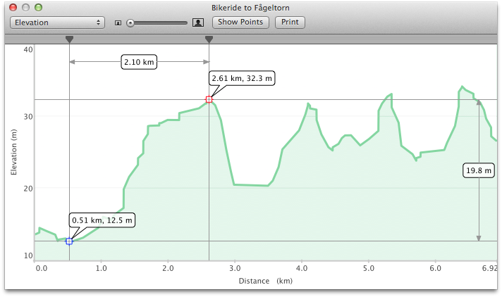 The software comes into its own when planning where to go, though. You can draw out potential routes on the maps and you’ll be given standard stuff like distance, but also a height map of the route. This is invaluable for planning outdoor treks — the route shown above was great fun because as the height map below shows, it’s paced nicely with each steep uphill part followed with a rest, and running it in reverse on the way home has a nice long downhill section to finish on.