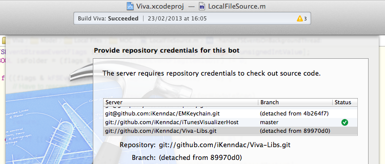 If you’re not sure if you have a detached HEAD, you can check from the command line or Xcode. On the command line, run git status in each submodule. If you get something like # HEAD detached at 89970d0, you’re in a detached HEAD. From Xcode, try to create a Bot. When it’s time to define authentication for each repository, Xcode will tell you the state of each submodule.