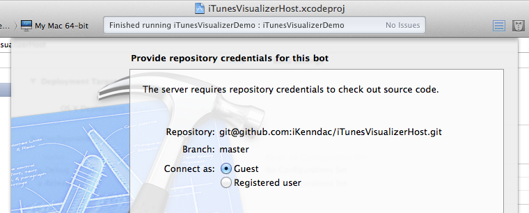 8) File a Radar asking Apple to add the SSH Key authentication option to Xcode itself. Feel free to duplicate mine: #15184645: Bots: Can’t enter an SSH Key to authenticate a repository in Xcode.