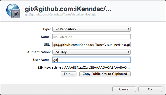 4) Open the Server application and find your new repository and edit it. Change the authentication method to SSH Key and the user name to the correct value (this is git for GitHub).