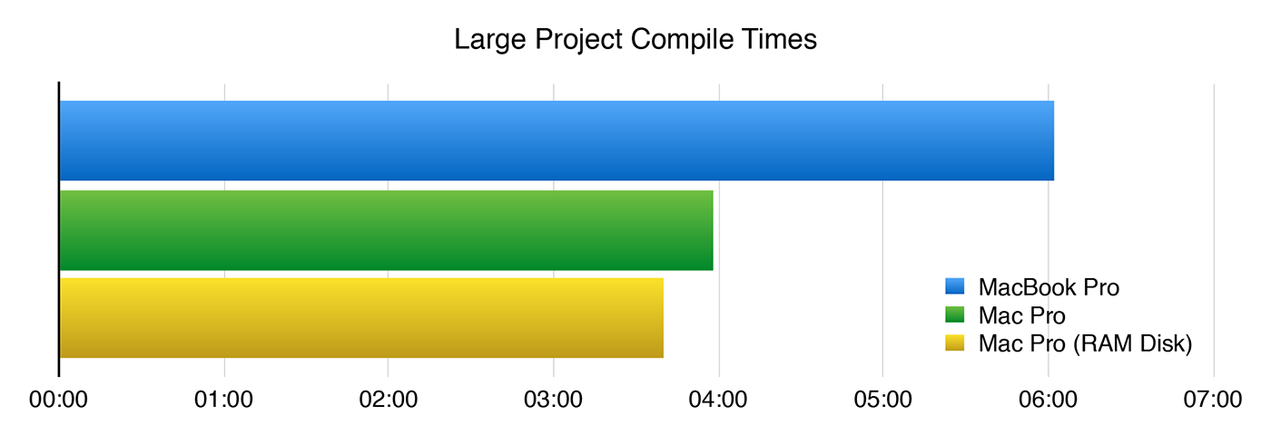 | Mac Pro (RAM Disk) | 5 seconds | 3 minutes, 40 seconds |