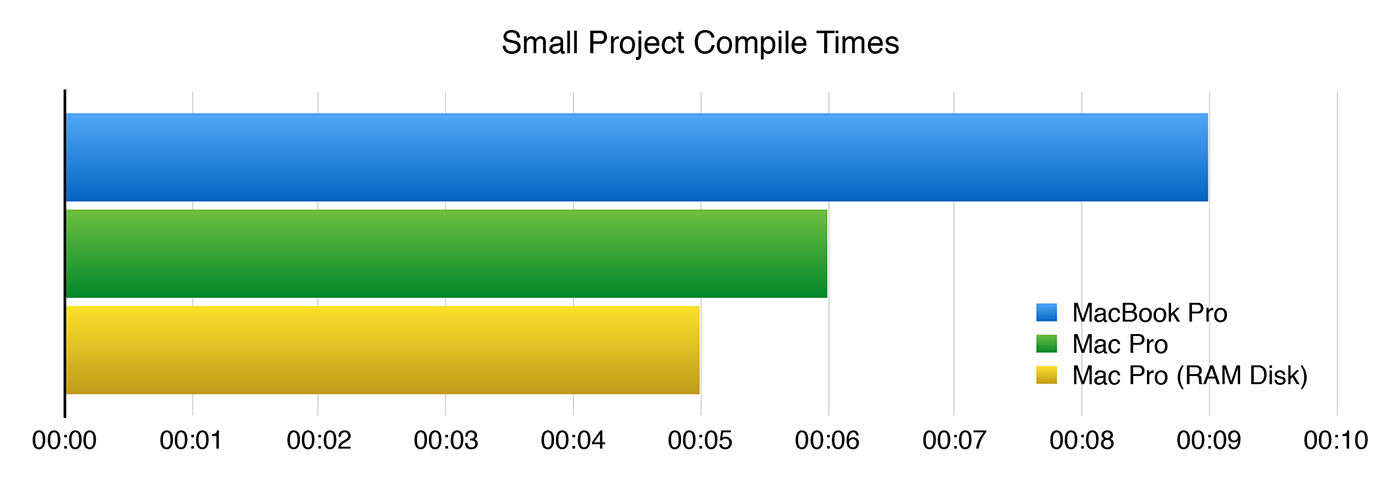 Since my Mac Pro has 32GB of RAM, I also benchmarked building the projects while using a RAM disk for Xcode’s Derived Data folder. I didn’t do this on the MacBook as 16GB isn’t enough to do this with the Large Project.