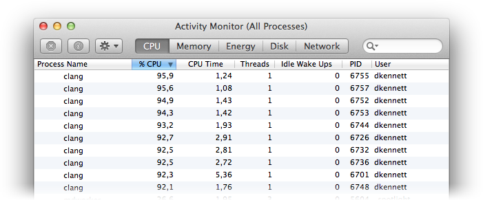 Build all the things! Activity Monitor wasn’t running during benchmark runs, but typical day-to-day apps were (email, Safari, Twitter, etc) to reflect a “normal” environment.